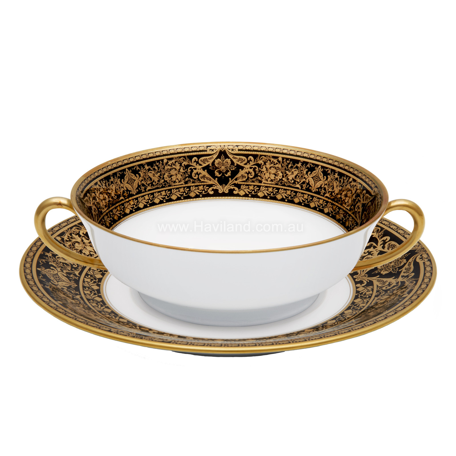 MATIGNON SOUP CUP AND SAUCER (GOLD BLACK RIM)