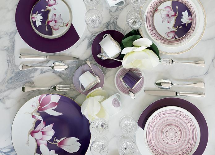 The Magnolia collection enhances traditional tables and emphasizes sophistication through bright colors and precise details. Blending flowery lines and latticework motifs, this audacious decoration combines modernity and originality, and surprises us piece by piece. From purple to burgundy, the pieces are declined in a whirlwind of solid colors, or enhanced by a magnolia flower accentuated by a gold filet, making it precious.