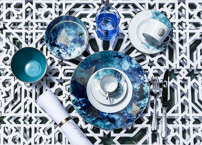 The craftsmen of the Haviland manufacturer explore the seabeds and invite us to dive with them to the heart of the oceans. From still life to abstract paintings, Océan Bleu perfectly translates the motion of the waves with an explosion of blue tones. It takes us on a journey to the depths of the sea where manta rays and jellyfish dance along the water flow. Each piece of this service is a unique painting designed by the manufacturer’s creative workshop. No less than four shades of blue intermingle to recreate the movement of the ocean, illuminated by marine animals in matt gold. A manta ray and a jellyfish swim on the rims of the plates or dishes to create an exceptional table service.