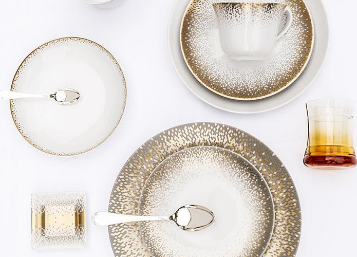 Like a shower of shooting stars, Souffle d’Or is a captivating and sparkling collection. It invites you on a journey through stars in motion that gather then scatter, on plates, teapots, and vases, resembling a breath of wind that diffuses and radiates.This constellation of iridescent gray and gold, available as solid colors or as fine stardust, narrates the know-how and technical skills of the renowned Maison Haviland. With the contemporary Souffle d’Or collection, your table will be enchanted with finesse and elegance, according to your desires and dreams.