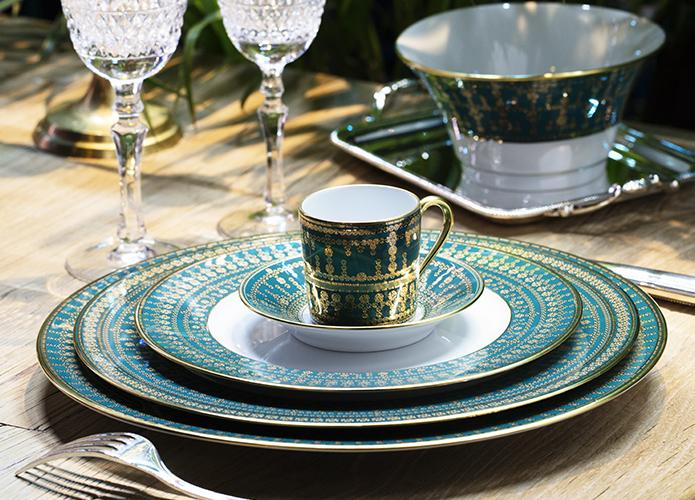 Glimmering, luxurious and contemporary, are the key words of the Tiara collection. Created in 2012, this collection is a symbol of elegance for the Haviland Manufacturer. In white, black, peacock blue or Prussian blue, this pattern reinvents itself as a seasonal fragrance. The enchantment of diamonds offers a perfect setting for this pattern that flawlessly reflects the Haviland Manufacturer’s commitment to refinement. The whiteness of porcelain, supported by these intense hues, reveals a modern-style service. Narrated in gold and in platinum, this motif metamorphoses progressively into a service composing of 28 dinner service pieces. Inspired by tiaras and famous crowns embellished with precious stones, Tiara is adorned with small and large diamonds to illuminate your tables with an infinite brilliance. In five letters, the Maison Haviland shares one of the most emblematic symbols of the French porcelain.