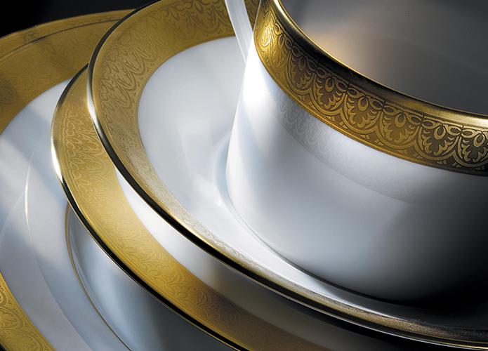 Valençay is a pattern in relief launched in 1993. Inspired by the Saint Gaudens inlay, a historical decoration dating back to the end of the 19th century, this collection highlights a frieze filled with matt gold. The relief gives rhythm to the decoration composed of leaves. Refined and precise, this decoration illustrates wonderfully the alliance of luxury and simplicity. The Valençay collection becomes synonymous with elegance.