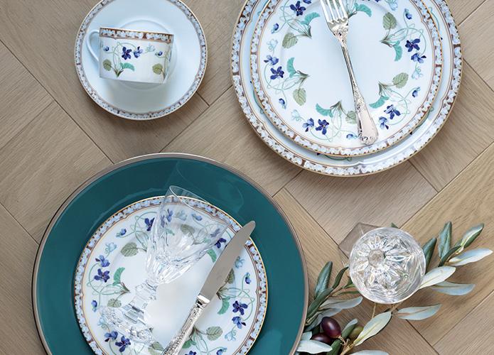 Léonce Ribière, a designer, created a pattern for the Empress Eugénie, which can now be seen in the Haviland Porcelain Museum in Limoges. His pupil Lassère reworked on his model, which later became the foundation of the Impératrice Eugénie pattern produced by Haviland in 1967, and still offered today. The Empress Eugénie contributed a great deal to the cultural life of the Court and France, and helped create the Napoleon III style.This pattern is decorated by several violets. In the language of flowers, the violet represents timidity, modesty and decency, referring to the little corolla that seemingly hesitates to emerge from its nest of leaves.