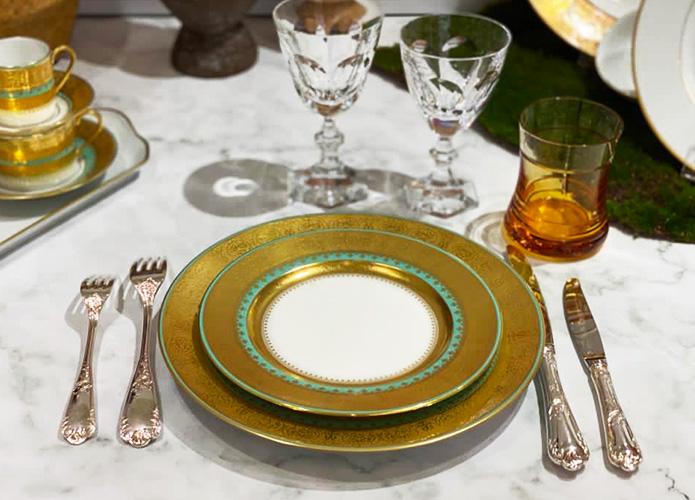 Bassora is an Inlay collection inspired by the decorative and ornamental boards from the archives of the Haviland atelier. Created in 2001, this collection modernizes the inlay category. The pattern is highlighted by a soft green background. The plain and clear background accentuates the detail of the oriental motifs. Here, tradition and know-how are combined to perfection.