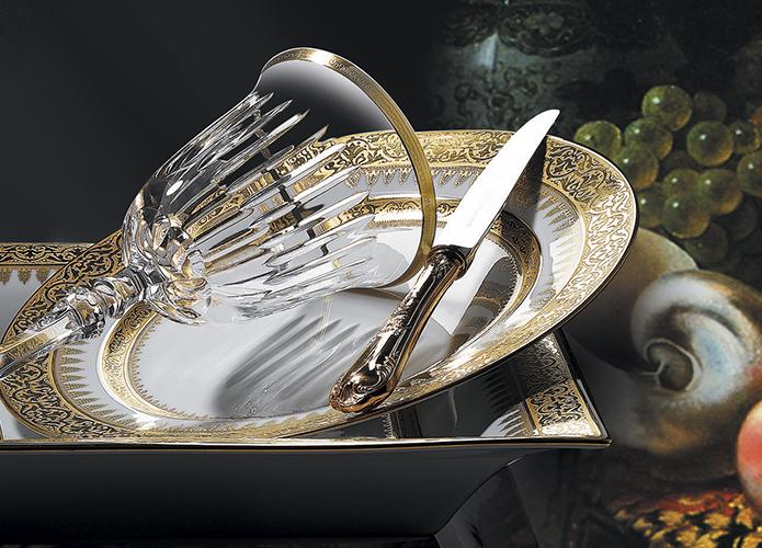 Matrah is a variation of the Orient Inlay collection. The central frieze is adorned with gold and green, set against a white background. The Orient Inlay dances on the edge of the plate, while the Louis XVIII Inlay on the marli delicately finishes the pattern. Matrah is a highlight of the collection, a variation dating from 1987.