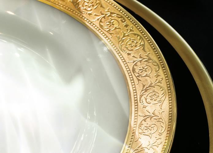 The Thistle collection was first created at the end of the 19th century. Thistle, a light and delicate inlay pattern considered a classic of the manufacturer, was revisited once again in the 1960s. Palmettes and flowers, a reference to the rocaille style, ornate this frieze in inlay with a double gilding. After engraving the motif, 2 layers of gold applied manually are required for the realization of this elegant creation. The agate stone finishing reveals this craft and brings all the magnificence to the collection.